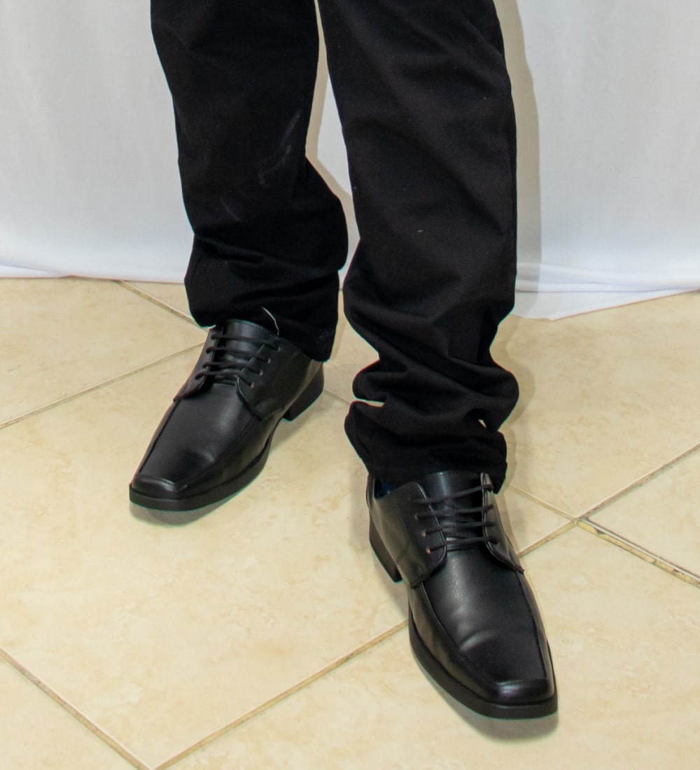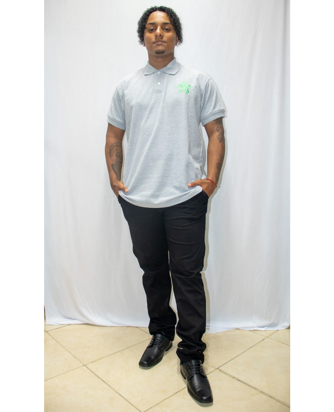 Camisa manga larga verde, pantalon negro, zapatos