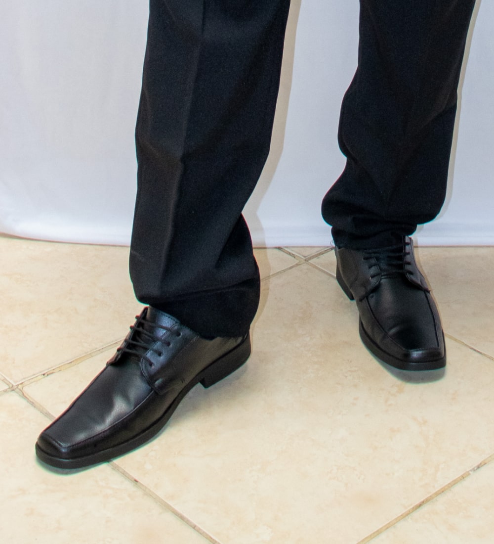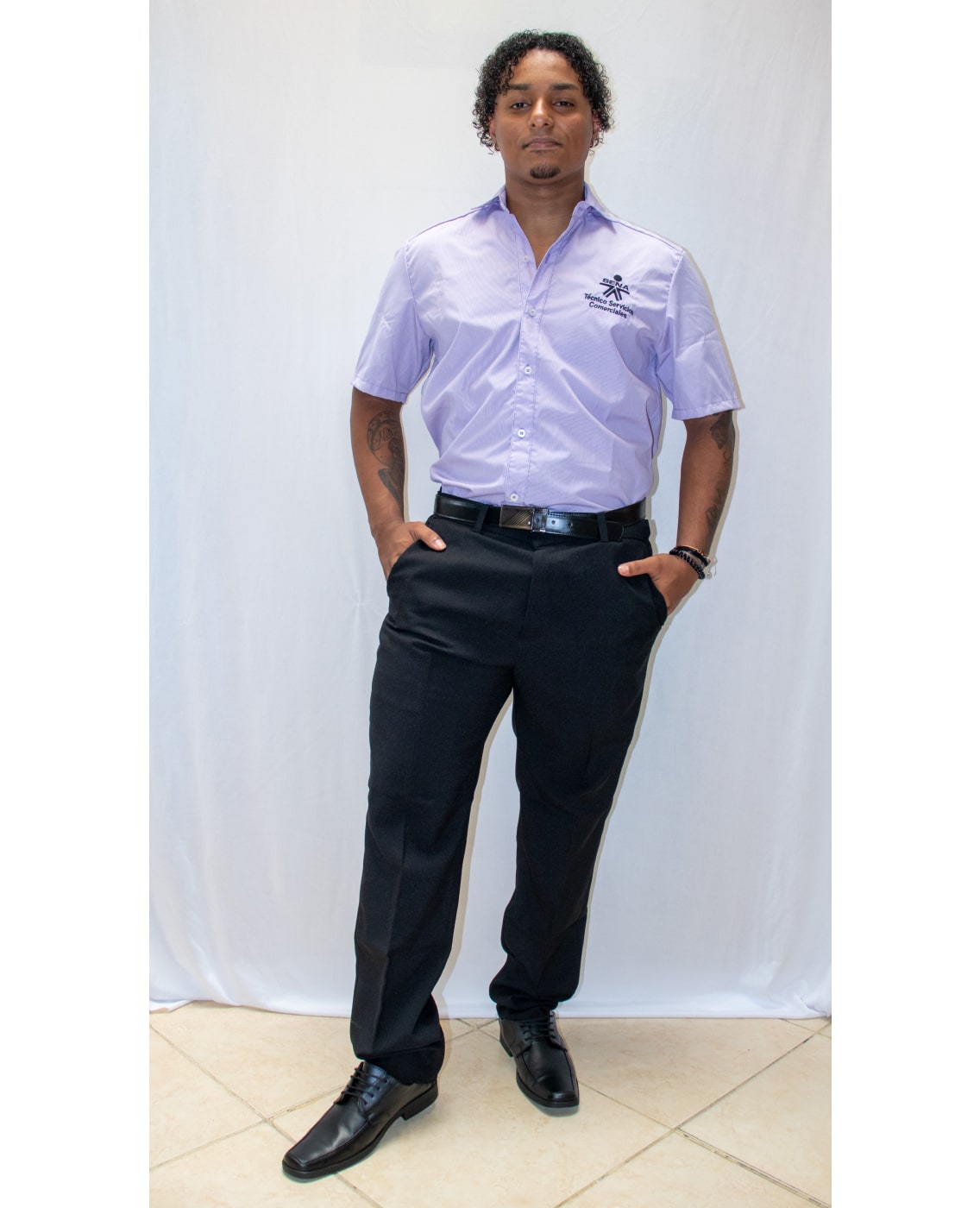 Camisa manga corta lila, chaleco, pantalon y zapatos